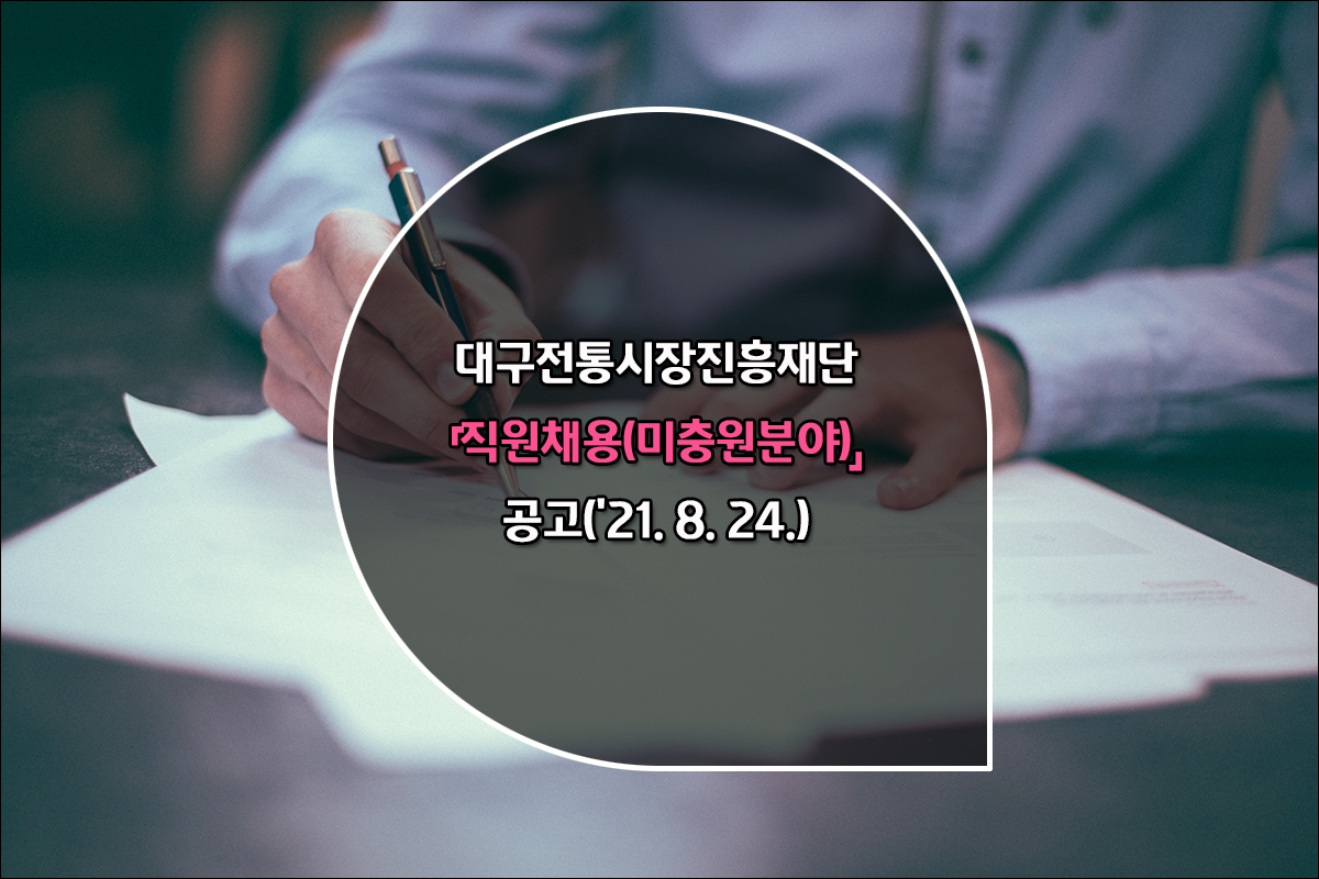 대구전통시장진흥재단(www.dtms.or.kr)에서는 대구지역 전통시장 발전 및 지역경제 활성화에 기여할 직원을 채용한다. (미충원분야 재공고, 공고일 2021. 8. 24.)