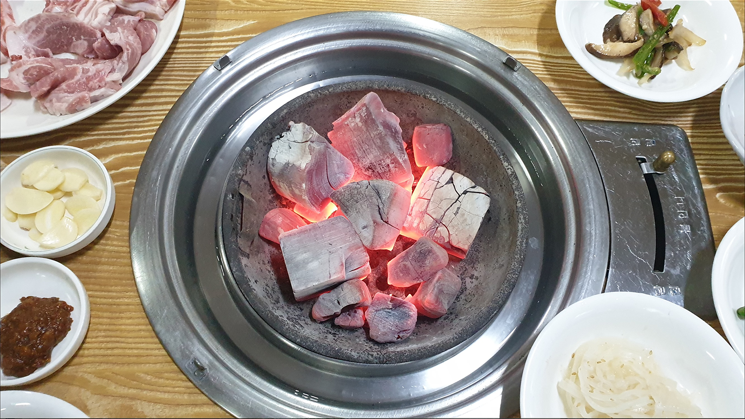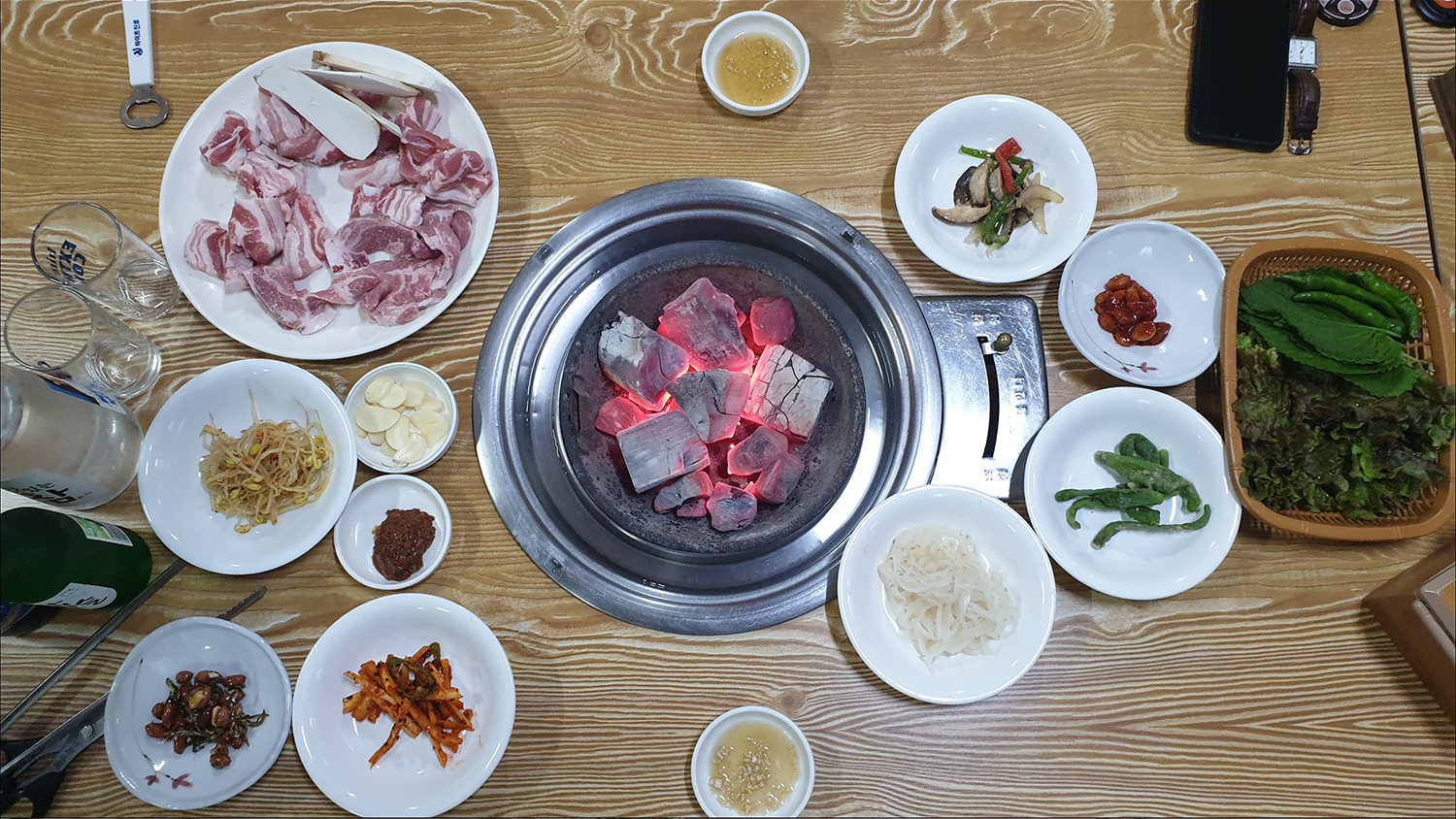 빨간 숯불에 고기를 올려보도록 하겠습니다.