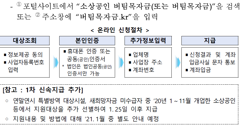 중소벤처기업부에서는 코로나19 확산으로 어려움을 겪고 있는 소상공인의 경영 안정을 위한 "소상공인 버팀목자금" 지원 계획을 공고했다.(1차, 2021. 1. 6.)