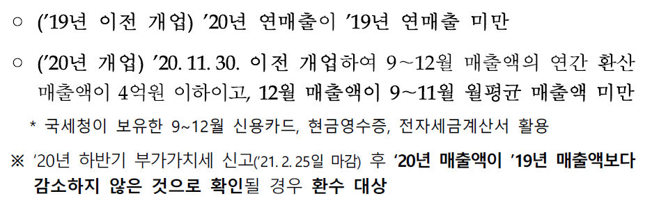 ③ 일반업종 : 2020년 연매출 4억원 이하이고 2020년 연매출이 전년대비 감소한 소상공인에 100만원 지원