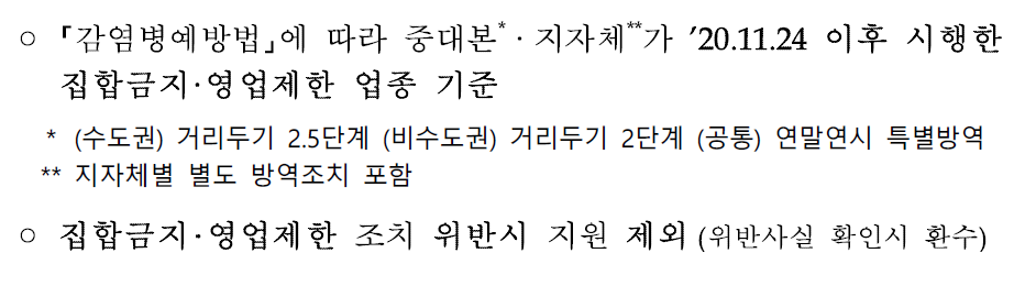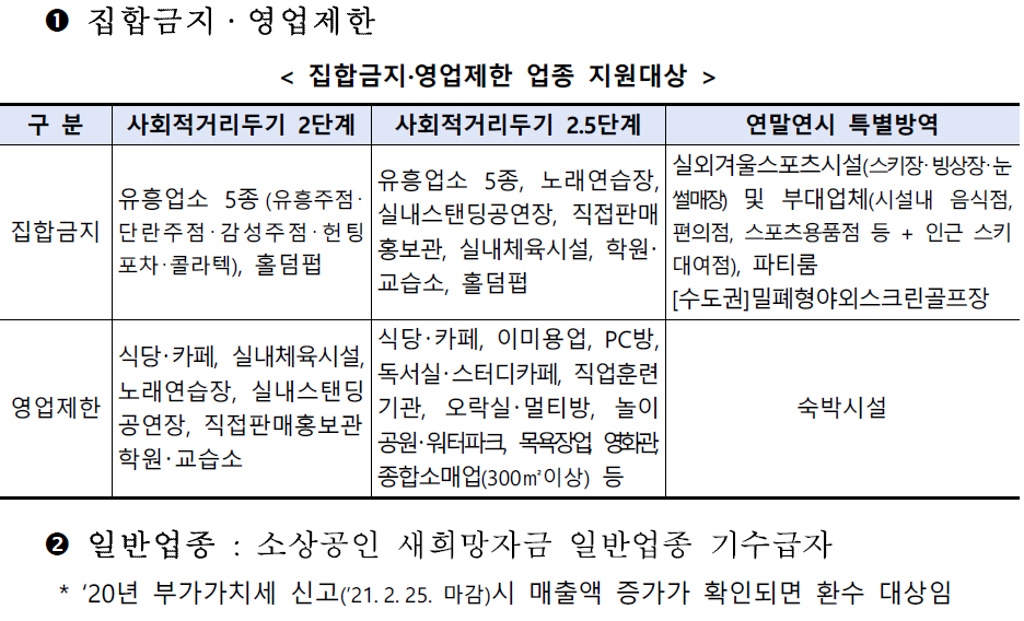 ② 집합금지 / 영업제한 : 중앙재난안전대책본부/지방자치단체의 방역강화로 집합금지 or 영업제한된 소상공인에 각각 300만원, 200만원