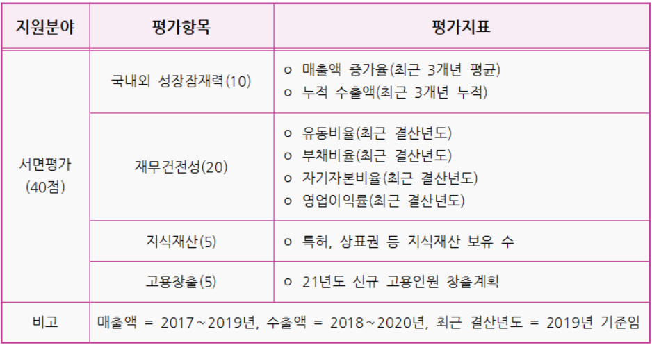 계량평가는 서면평가로 진행되며 국내외 성장잠재력, 재무건전성, 지식재산, 고용창출 등을 평가한다.