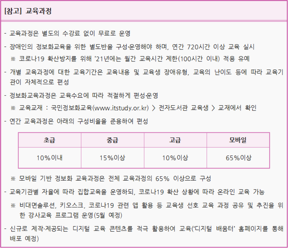 교육과정은 별도의 수강료 없이 무료로 운영하고, 장애인의 정보화교육을 위한 별도반을 구성/운영해야 한다.(연간 720시간 이상 교육실시)