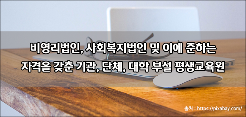 일단 총 6개 기관 및 단체를 모집합니다. 법령에 의한 비영리법인, 사회복지법인 및 이에 준하는 자격을 갖춘 기관, 단체,대학 부설 평생교육원을 대상으로 모집합니다.