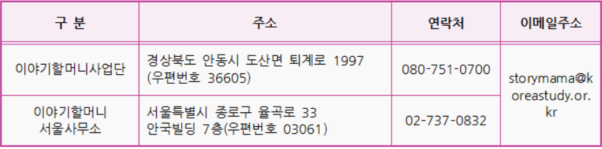 한국국학진흥원의 2021년 제13기 아름다운 이야기할머니 신규모집에 대한 문의는 표를 참고하시길 바랍니다.