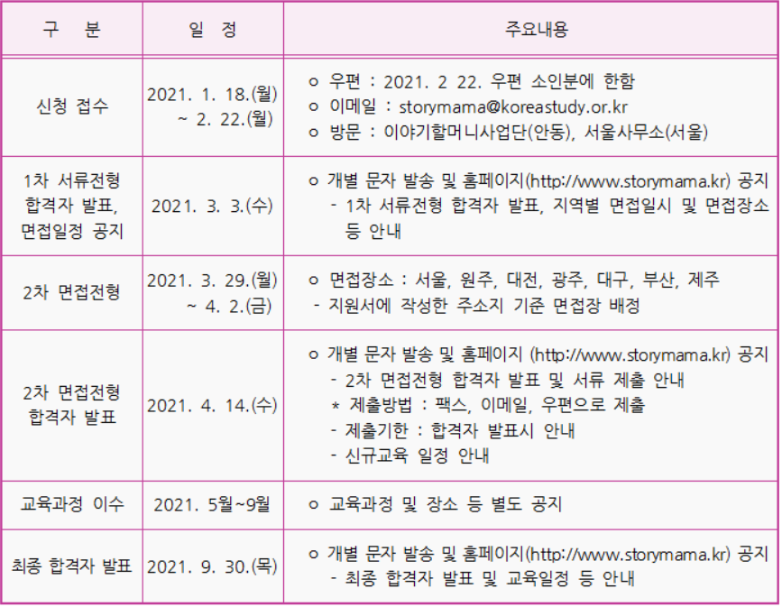 한국국학진흥원에서 신규모집하는 2021년 아름다운 이야기할머니의 선발인원은 500명입니다.(권역별로 155개 시/군/구). 공고일 전일 기준으로 주민등록상 주소지로만 응시가 가능합니다.