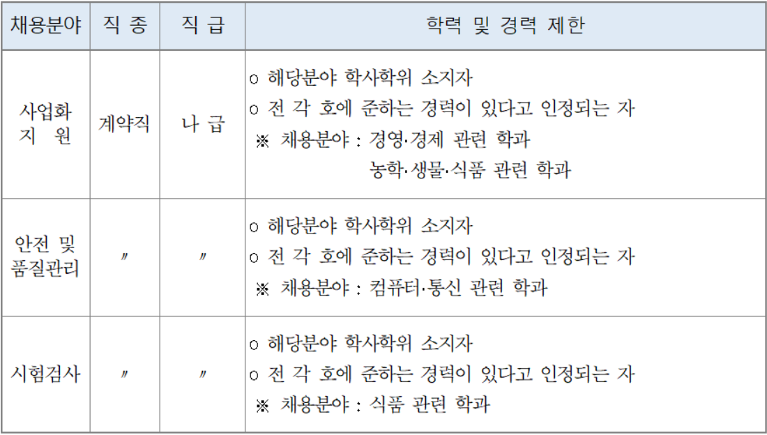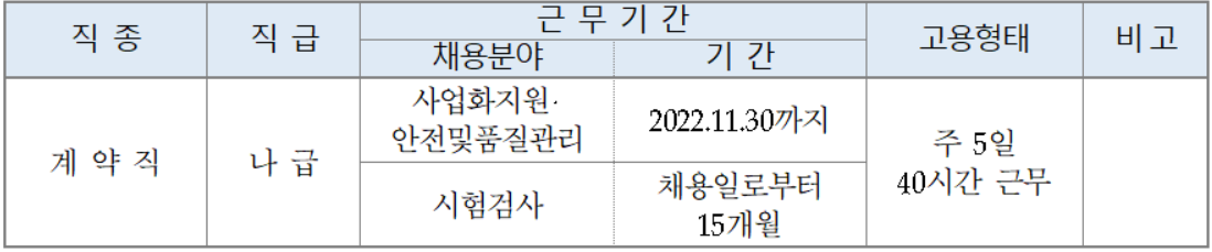 모두 계약직(나급)으로 고용되며, 사업화지원 과 안전 및 품질관리 분야의 계약기간은 2022. 11. 30.까지이고, 시험검사 분야는 채용일로부터 15개월이다.(주 5일, 40시간 근무)