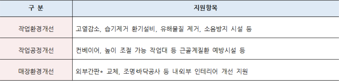 ▶시설개선은 작업환경개선, 작업공정개선, 매장환경개선 중 1가지 항목에 대하여 한도 내 지원(업체당 지원한도 420만원, 부가세 자부담) 하고 ▶판로지원은 제품 상세페이지 제작, 기획전 입점, 라이브커머스, 구독경제 구축 등 온라인 판로지원 한다.(※ 라이브커머스, 구독경제 구축은 판로지원 업체 중 선별 지원)