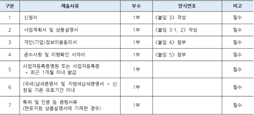 신청 시, 신청서, 사업계획서 및 상품설명서 등을 작성하여 스캔해서 온라인으로 첨부하면 된다.