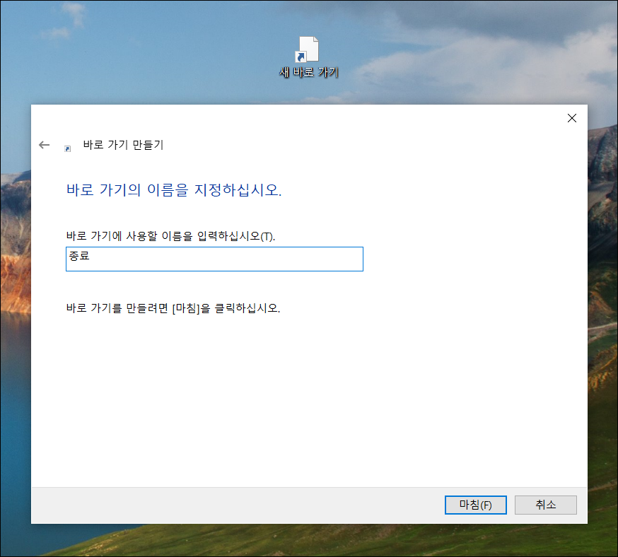 저는 "종료"라고 적었습니다만 "윈도우종료" "시스템종료" 등 여러분 마음데로 입력해주시면 됩니다.