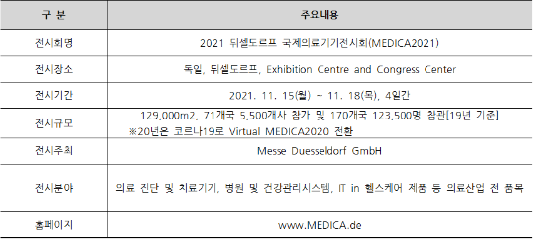 2021 뒤셀도르프 국제의료기기전시회는 2021. 11. 15.(월) ~ 11. 18(목)까지 Exhibition Centre and Congress Center 에서 개최되며, 2019년 기준으로 129,000m2, 71개국 5,500개사 참가 및 170개국 123,500명 참관했다.