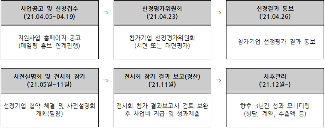 단, 부스임대장치비 일부 및 항공료, 체제비, 물류비 등은 기업이 부담해야 한다.