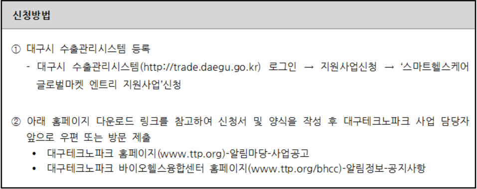 지원대상은 지역 스마트헬스케어산업 관련 제품(의료기기 및 웰니스 기기 등)을 생산하는 벤처중소기업으로서 글로벌 시장 진출을 진행하고 있거나 고려중인 기업을 대상으로 한다. (※ 수혜기업은 ‘MEDICA 2021' 전시회에 출품할 전시품을 2021 메디엑스포 코리아(2021. 7. 2~4) 및 대구액티브시니어박람회(2021. 11. 10~12)에 출품, 참가하여야 함)