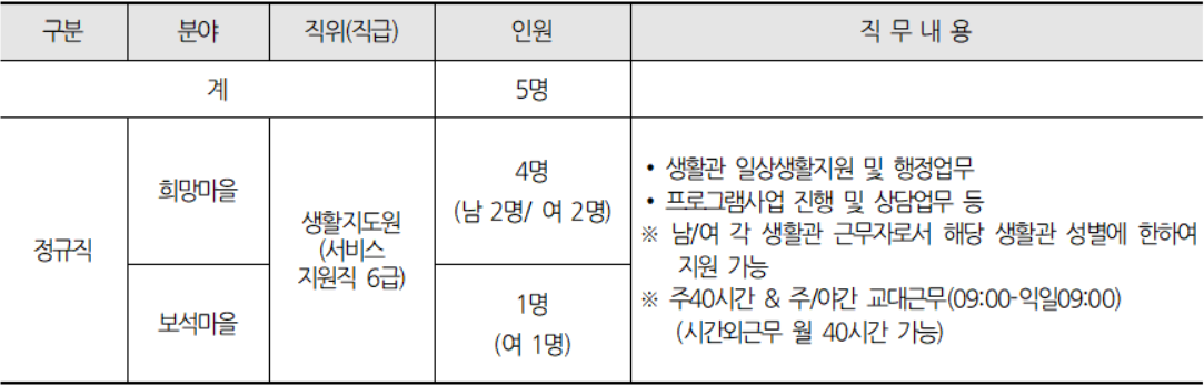 소식시설의 희망마을 4명과 보석마을 1명을 채용할 예정이다(정규직, 생활지도원, 서비스지원직 6급)