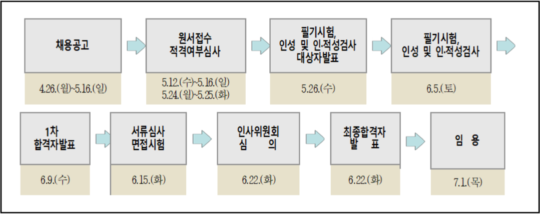 2021년 제2차 직원채용은 공고 → 원서접수 및 적격여부 심사 → 필기시험, 인성 및 인/적성검사 대상자 발표 → 필기시험, 인성 및 인적성검사 → 1차 합격자발표 → 서류심사 면접시험 → 인사위원회 심의 → 최종합격자 발표 → 임용(7.1. 목) 순으로 진행된다.