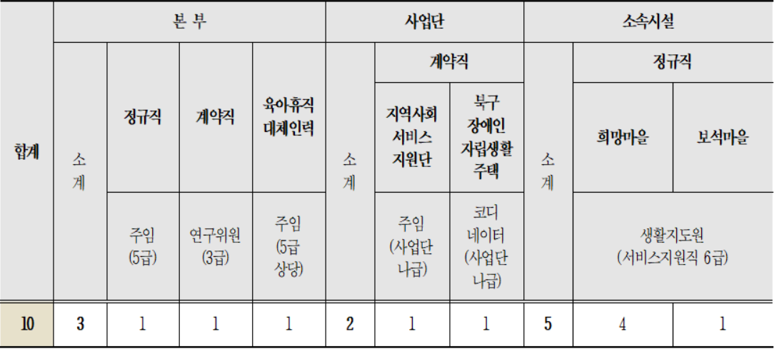 본부에서는 정규직 1명(정규직 주임, 5급), 연구위원 1명(계약직, 3급), 유아휴직 대체인력 1명 (주임, 5급 상당) 등 총 3명을 채용할 예정이고, 사업단의 경우 지역사회서비스지원단 1명(계약직 주임, 사업단 나급), 북구장애인자립생활주택 1명(계약직 코디네이터, 사업단 나급)을 채용할 예정이다.