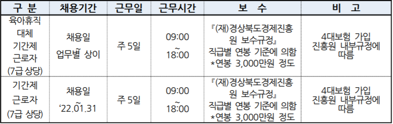 채용예정인 기간제 근로자는 주5일, 09:00 ~ 18:00 까지 근무하게 되며, 경상북도경제진흥원 보수규정 직급별 연봉 기준에 따라 연봉 3,000만원정도이며 4대보험에 가입된다.