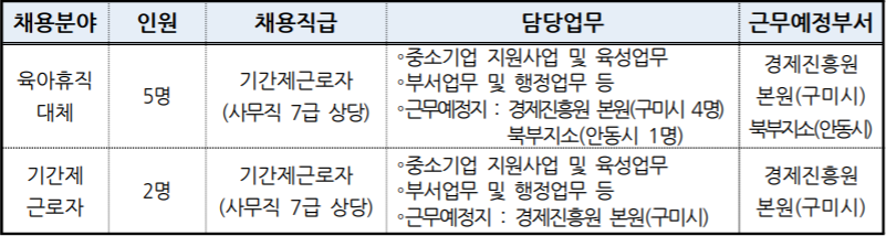 경상북도경제진흥원 기간제근로자 채용은 육아휴직대체 5명, 기간제 근로자 2명이다. (사무직 7급상당)