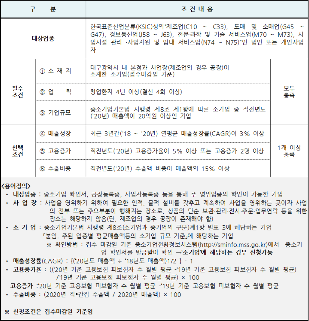 대구광역시 내 본점과 사업장(제조업의 경우 공장)이 소재한 소기업(접수마감일 기준) 중에 ① 투자실적(창업 후 누적 투자유치 실적 3억원 이상) ② 기술신용평가(접수 마감일 기준 유효한 기술신용평가(TCB) T-6 등급 이상) ③ 기 타(중기부 : 소재/부품/장비 스타트업그린뉴딜 유망기업 100, K-유니콘 프로젝트(예비유니콘, 아기유니콘 200) | 환경부 : 그린뉴딜 유망기업 100 | 과기부 : SW고성장클럽 200 글로벌 ICT 미래 유니콘) 중 1개 이상 충족되어야 한다.