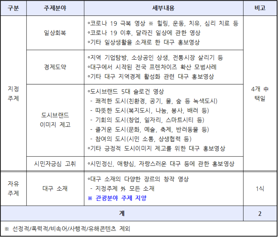지정주제 및 자유주제 중 택일하여 팀당 각 1편(3분할) 영상 신규 기획/촬영/편집 등을 진행하여야 하며, 영상 제작 전 최종 기획서는 대구시 및 진흥원과 필수적으로 협의해야 한다.
