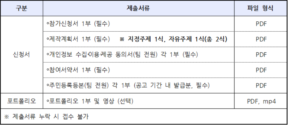 신청을 희망하는 경우, 제출서류와 포트폴리오를 갖추어 이메일 dccb@dip.or.kr 로 접수하면 된다. 접수시 신청서 및 포트폴리오(영상)파일은 압축아여 제출파일명을 팀명.zip으로 제출하면 된다.