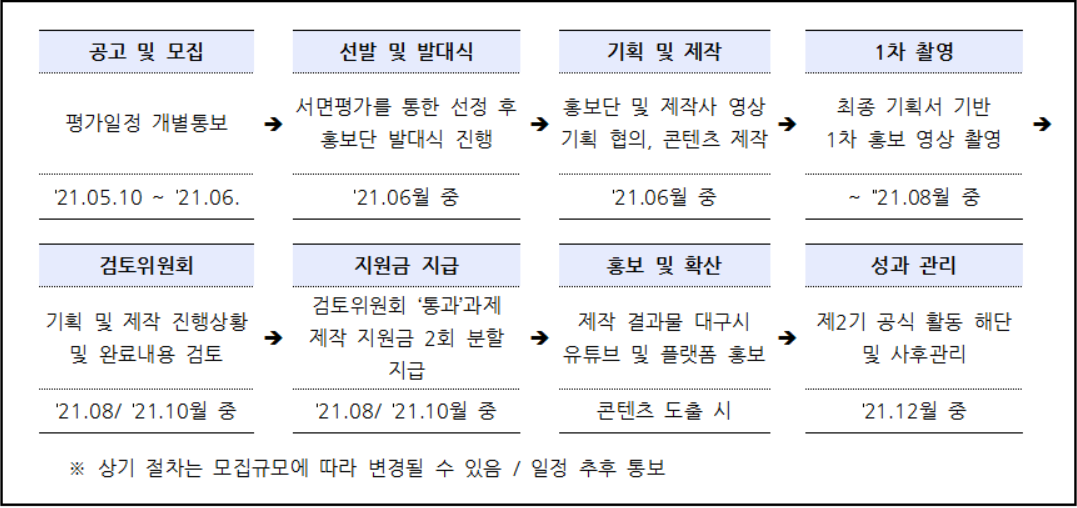 대구로 마카모디 2기는 모집하여 선발 및 발대식 → 기획 및 제작 → 1차 촬영 → 검토위원회 → 지원금 지급 → 홍보 및 확산 → 성과관리 순으로 추진된다.