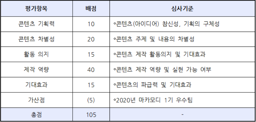 선정기준(가산점 포함 총점 105점)은 ▶콘텐츠 기획력(10, 콘텐츠(아이디어) 참신성, 기획의 구체성), ▶콘텐츠 차별성(20, 콘텐츠 주제 및 내용의 차별성), ▶활동 의지(15, 콘텐츠 제작 활동의지 및 기대효과), ▶제작 역량(40, 콘텐츠 제작 역량 및 실현 가능 여부), ▶기대효과(15, 콘텐츠의 파급력 및 기대효과), ▶가산점(5, 2020년 마카모디 1기 우수팀) 등이다.