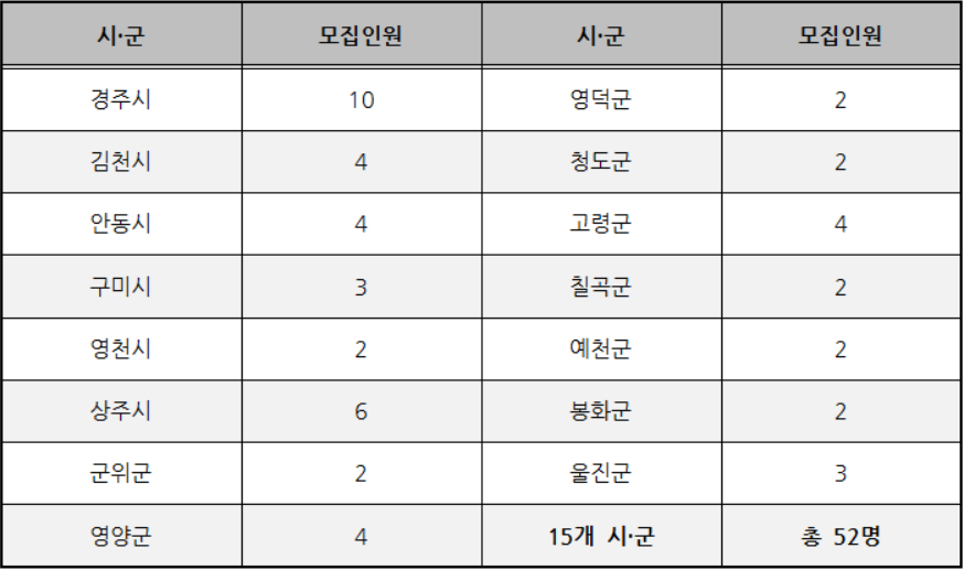 - 신청자는 최초 공고일 전일 기준 경상북도 외에 주소*를 두어야 함(주소지는 주민등록등본 상 주소지를 의미함)