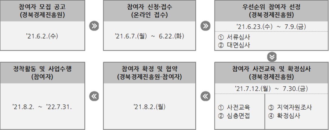 경상북도경제진흥원에서는 경상북도 및 시/군과 함께 경상북도 지역자원을 활용한 창업 및 지역정착 지원을 통해 지역활력을 도모할 청년 참여자를 모집한다.