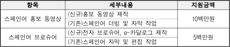 특히, 홍보동영상 및 브로슈어 제작 지원에 있어서 지원분야별 중복신청이 가능하고, 총액 기준 최대 10백만원 한도로 지원한다. 신청서 및 견적서를 검토 한 후 적정 지원금이 결정된다.(※총 사업비가 지원 한도를 초과한 경우 초과 금액(비용)에 대해서는 선정기업이 부담해야 한다.)