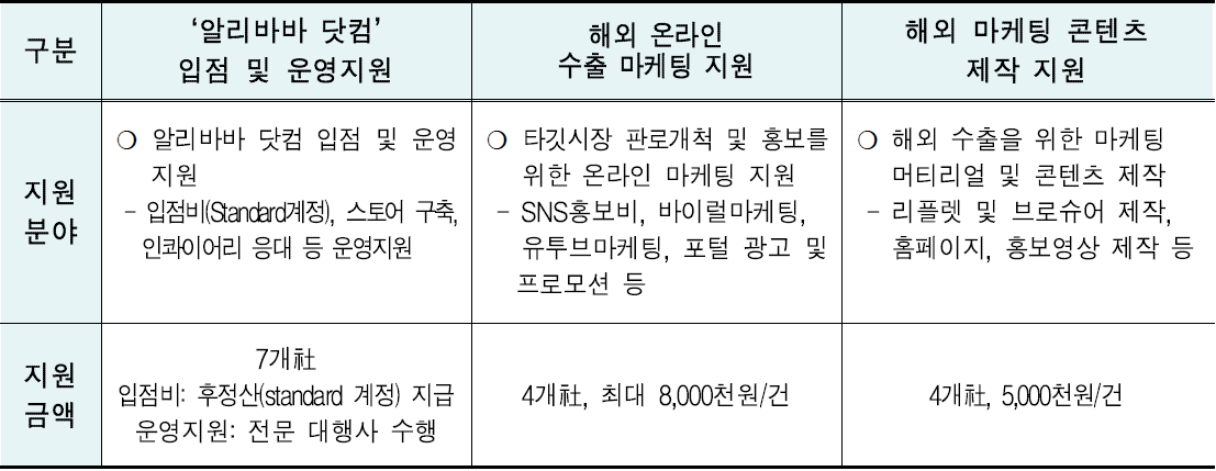 온라인 비지니스 플랫폼 '알리바바닷컴' 입점 및 운영지원에서는 7개사 정도를 선정하여 알리바바닷컴 입점비 및 운영을 지원한다.