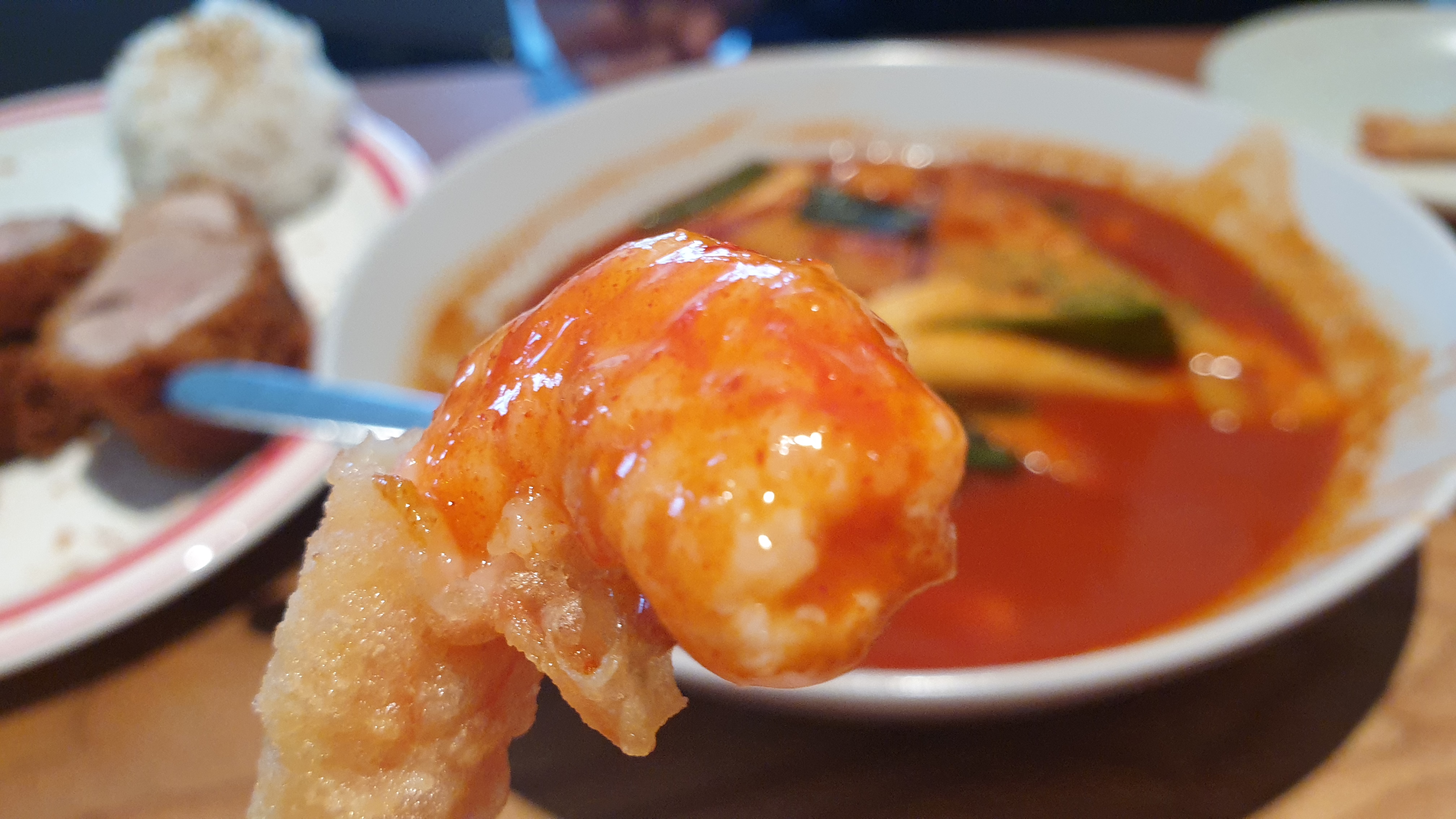 저는 여러가지 소스가 있었지만 떡볶이에 찍어 먹는 맛이 제일 맘에 들었습니다. 돈가스도 떡볶이 소스에, 새우튀김도 떡볶이 소스에~~ 퐁당 퐁당