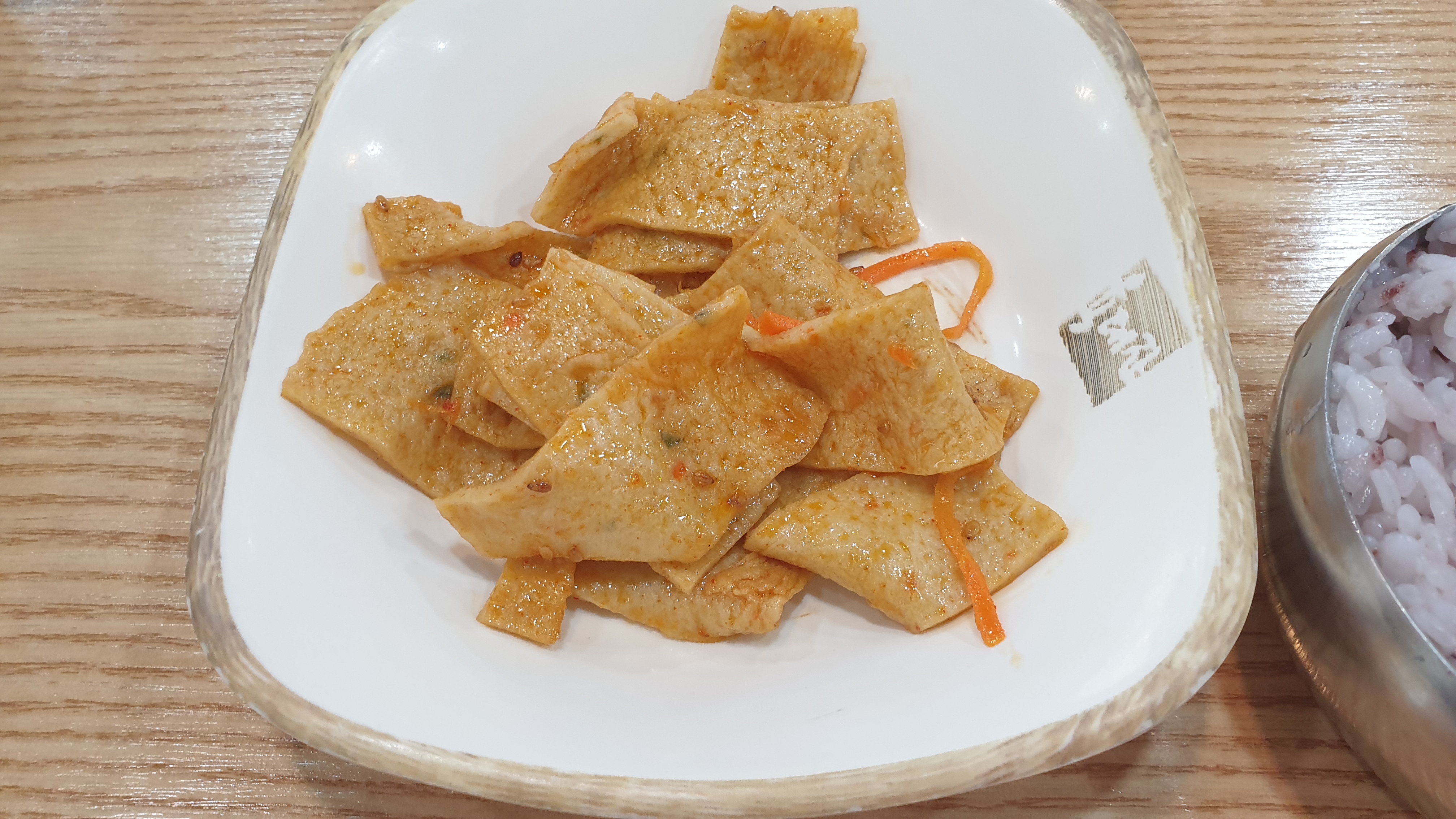 음식나오기 전에 어묵 하나, 깍두기 하나 냠냠~ 깍두기가 딱 알맞게 익었습니다.