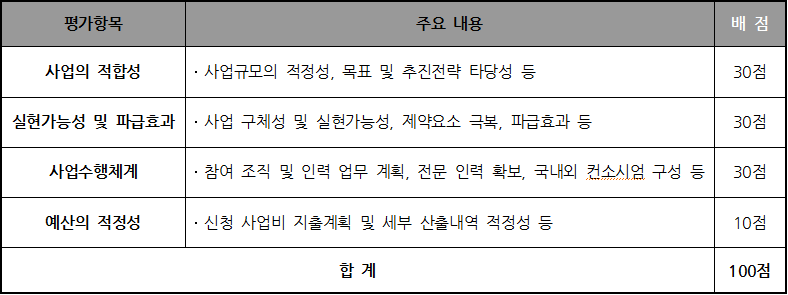 본 사업은 공고 → 사업계획서 접수 → 서류심사 → 대면평가 → 사업 내용 수정 보완 → 협약체결 순으로 진행된다.