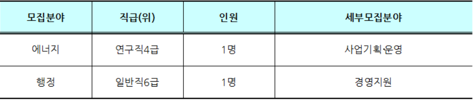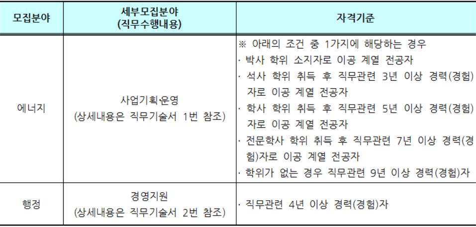 모집분야 중 ① 에너지 분야의 직무수행내용(세부모집분야)는 사업기획/운영으로서 ▶박사 학위 소지자로 이공 계열 전공자, ▶석사 학위 취득 후 직무관련 3년 이상 경력(경험)자로 이공 계열 전공자, ▶학사 학위 취득 후 직무관련 5년 이상 경력(경험)자로 이공 계열 전공자, ▶전문학사 학위 취득 후 직무관련 7년 이상 경력(경험)자로 이공 계열 전공자, ▶학위가 없는 경우 직무관련 9년 이상 경력(경험)자 중 1가지에 해당해야 한다.