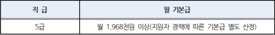 5급직의 경우 월 기본급은 월 1,968천원 이상(지원자 경력에 따른 기본급 별도 산정)이고 법정수당(초과근로수당)은 별도 지급한다.(근로기준법 제56조 의거) 더불어 복리후생수당(정액급식비, 직급보조비, 가족수당)은 대구전통시장진흥재단 보수규정에 의거하야 직급에 따라 별도 지급된다.