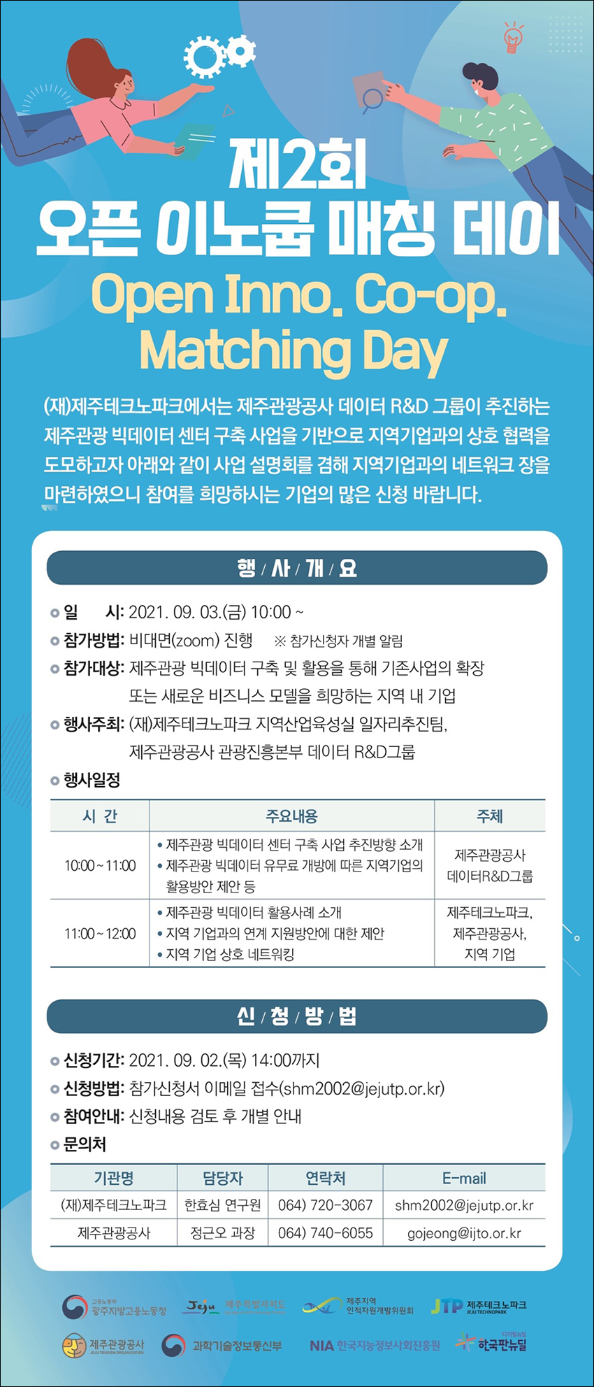 제주테크노파크에서는 제주관광공사 데이터 R&D 그룹이 추진하는 제주관광 빅데이터 센터 구축 사업을 기반으로 지역기업과의 상호협력을 도모하고자 "제2회 오픈 이노쿱 매칭데이"를 통해 사업설명회와 지역기업과의 네트워크 장을 마련한다.