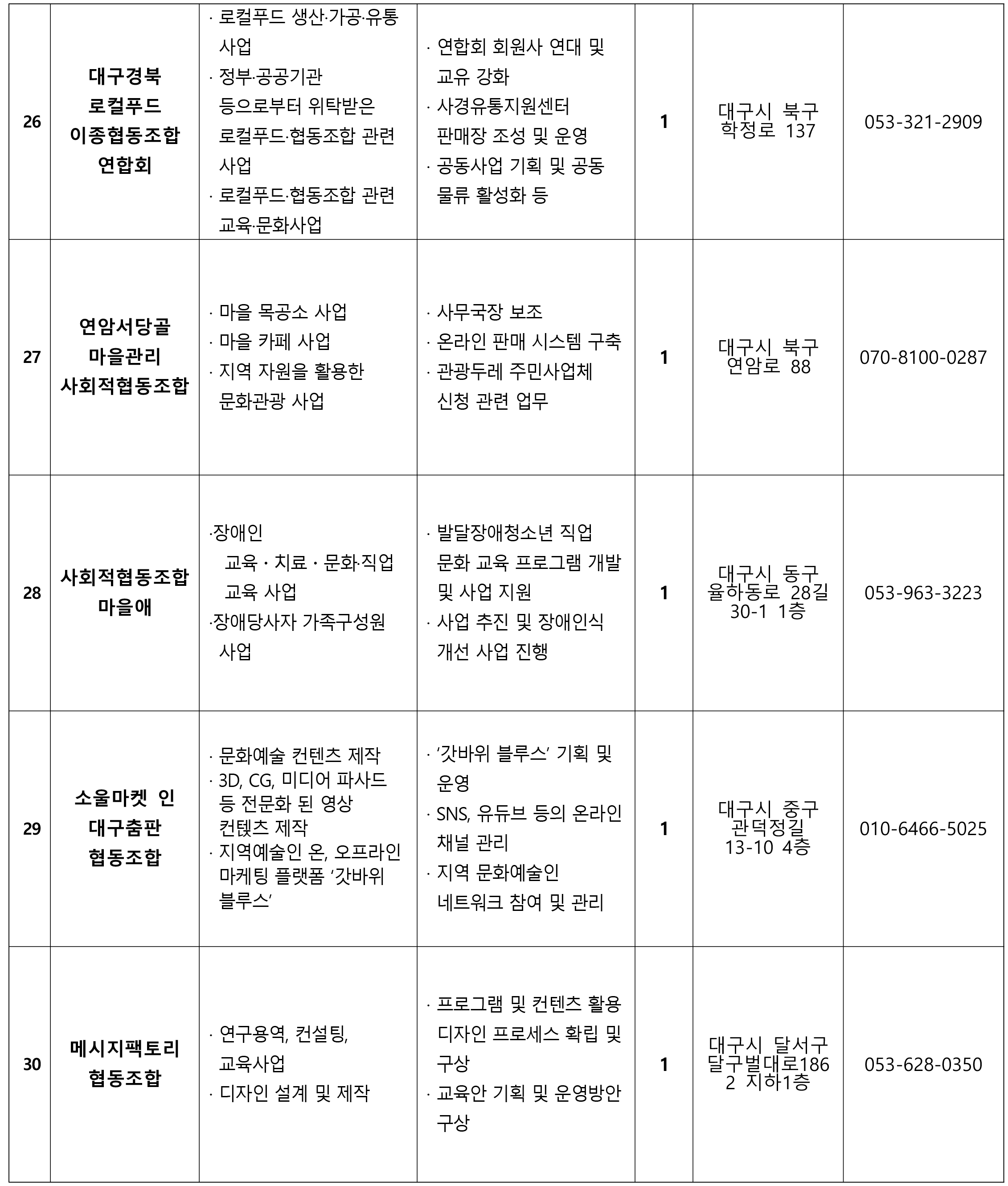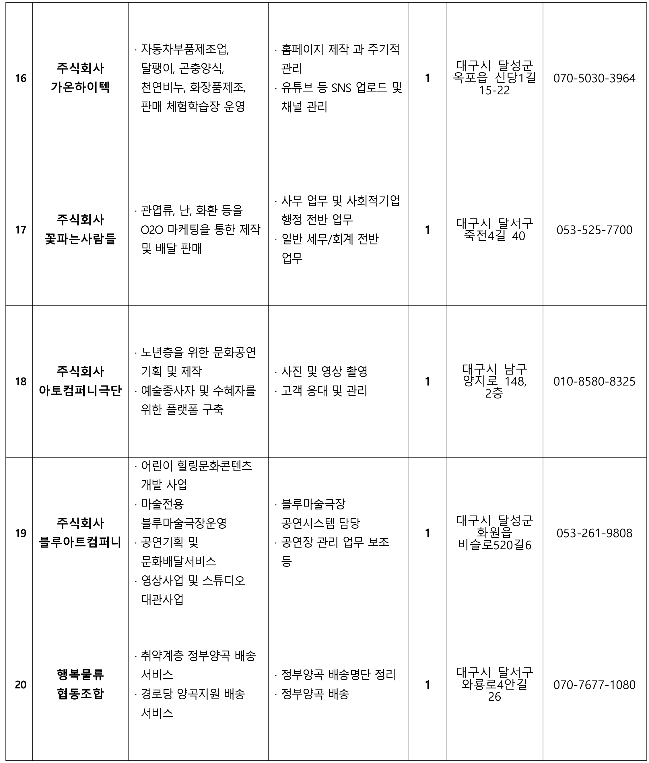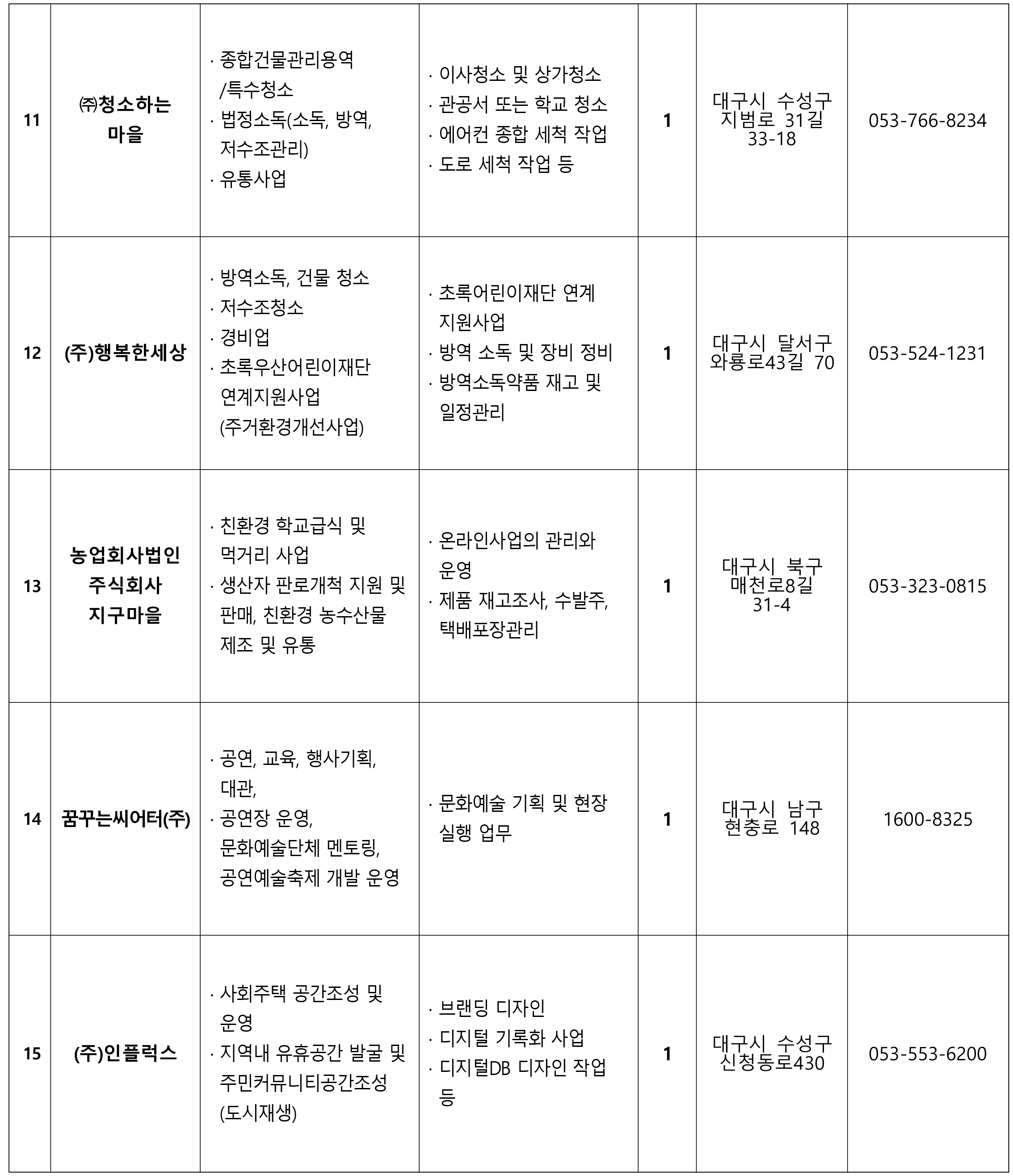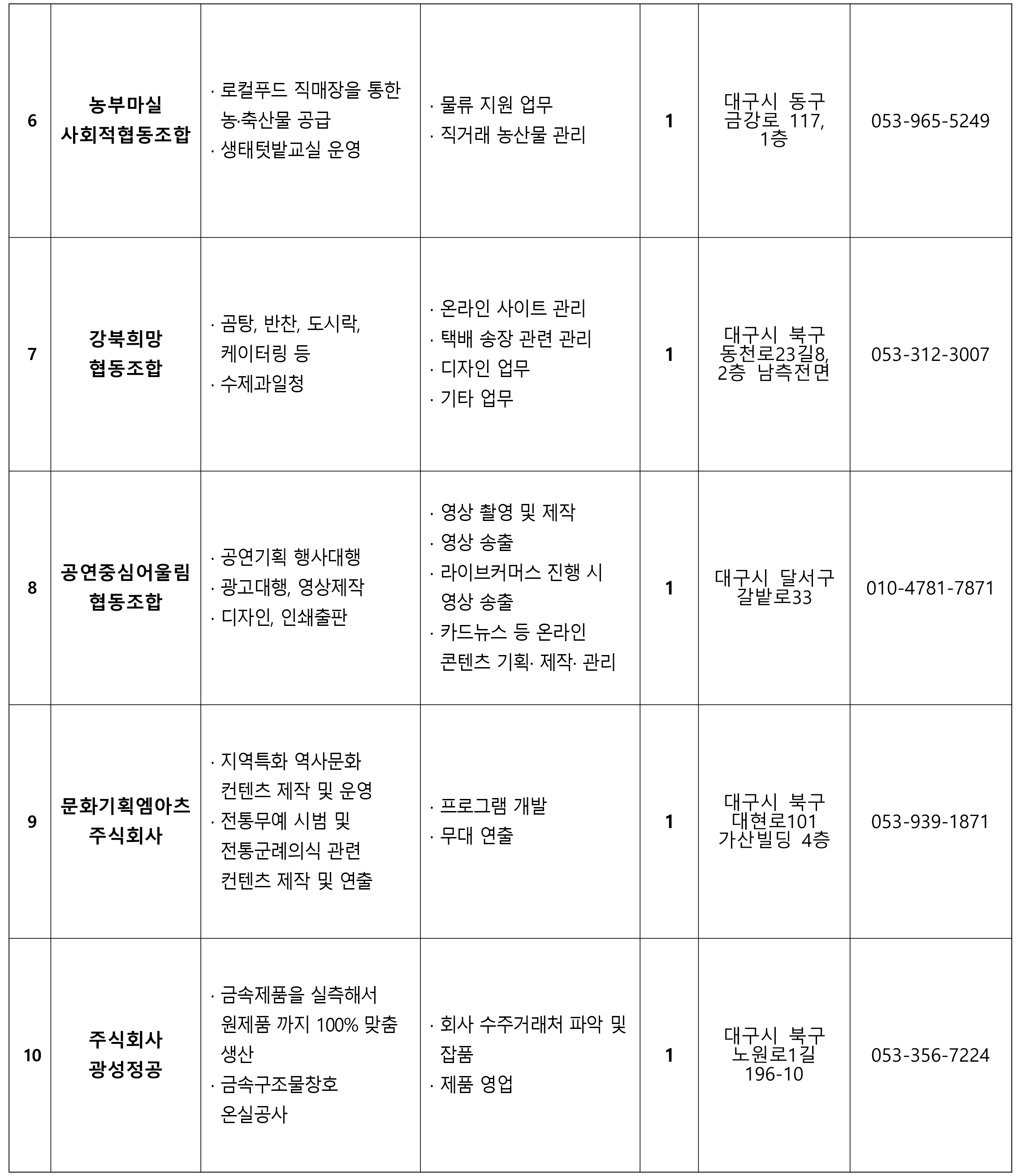 대구 사회적경제 청년인턴사업 참여기업 명단