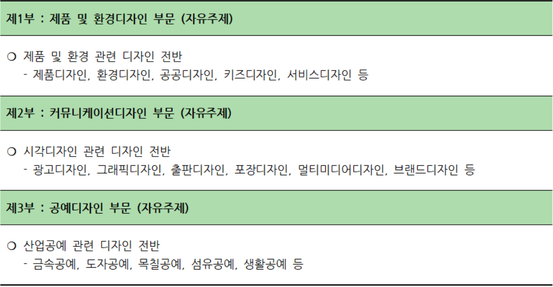 마지막으로 3부 공예디자인 부문은 산업공예 관련 디자인 전반(금속공예, 도자공예, 목칠공예, 섬유공예, 생활공예 등)을 대상으로 한다.