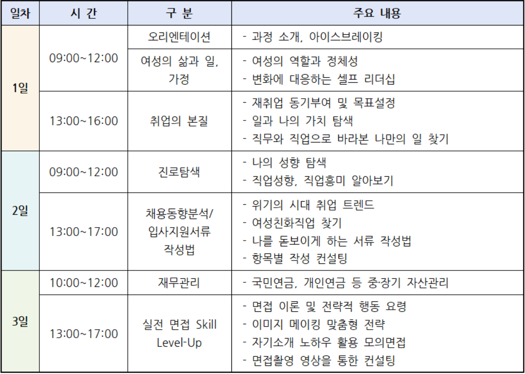 교육과정은 1일차에는 ▶오리엔테이션(과정 소개, 아이스브레이킹), ▶여성의 삶과 일, 가정(- 여성의 역할과 정체성, - 변화에 대응하는 셀프 리더십), ▶ 취업의 본질(- 재취업 동기부여 및 목표설정, - 일과 나의 가치 탐색, - 직무와 직업으로 바라본 나만의 일 찾기)을 진행한다.