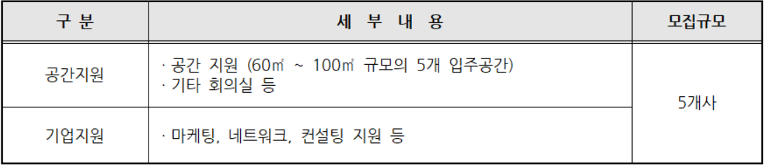공간은 60㎡ ~ 100㎡ 규모의 5개 입주공간과 회의실이다.