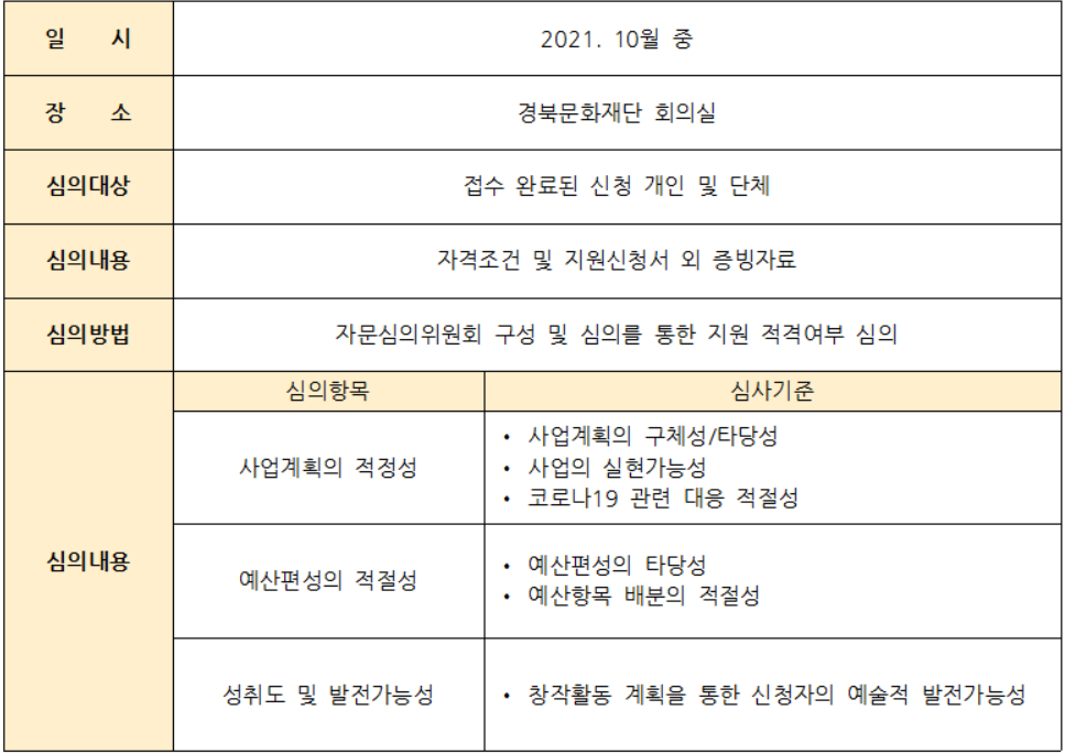 선정은 심의위원회를 구성하여 서류를 심의하고 선정하며 결과는 경북문화재단 홈페이지를 통해 2021. 10. 22.(금) 발표할 예정이다.