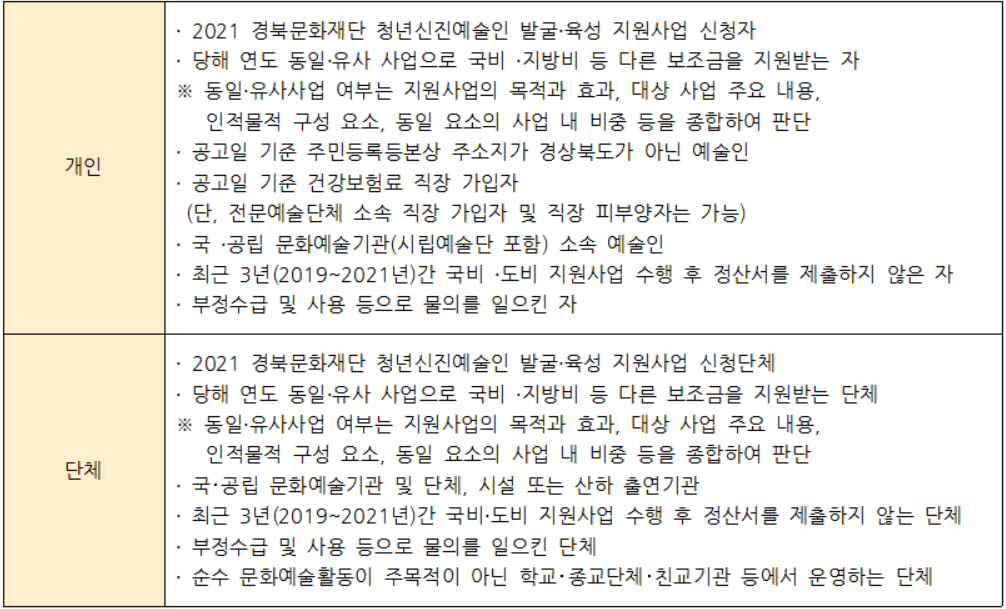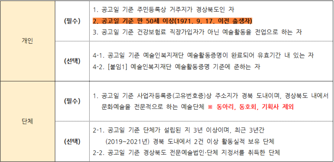 개인의 경우 ① 공고일 기준(2021. 09. 17.) 주민등록상 거주지가 경상북도인 자 ② 공고일 기준 만 50세 이상(1971. 9. 17. 이전 출생자) ③ 공고일 기준 건강보험료 직장가입자가 아닌 예술활동을 전업으로 하는 자 등은 필수 조건이고, ▶ 공고일 기준 예술인복지재단 예술활동증명이 완료되어 유효기간 내 있는 자 ▶ 예술인복지재단 예술활동증명 기준에 준하는 자 등은 선택 자격 중 1개 이상 충족되어야 한다.