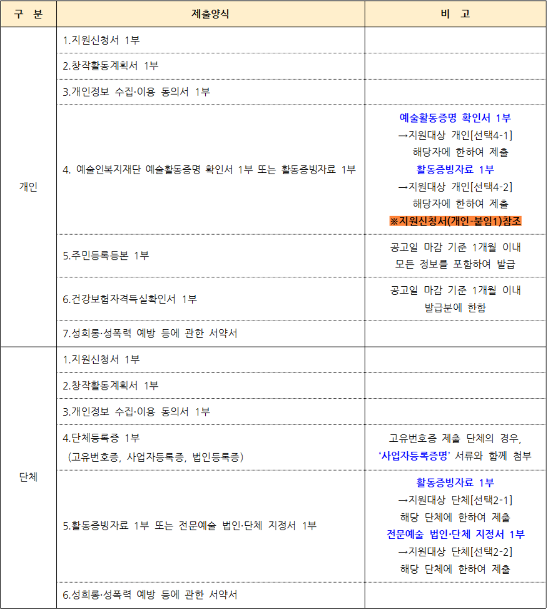 단체의 경우 공고일 기준 사업자등록증(고유번호증)상 주소지가 경북 도내이며, 경상북도 내에서 문화예술을 전문적으로 하는 예술단체( ※ 동아리, 동호회, 기획사 제외)여야 하고(필수조건),