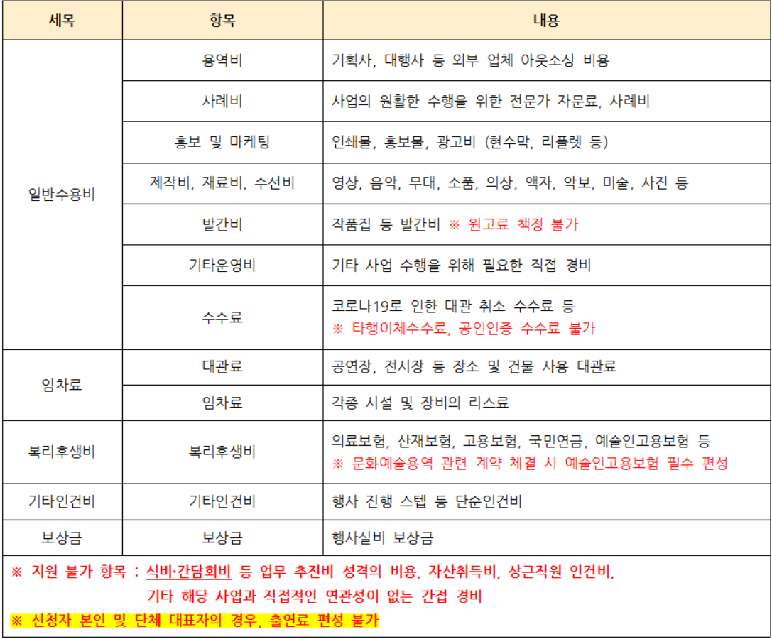 일반수용비(용역비, 사례비, 홍보 및 마케팅, 제작비, 재료비, 수선비, 발간비, 기타운영비, 수수료) ,임차료(대관료,임차료) ,복리후생비, 기타인건비, 보상금 등을 지원한다.