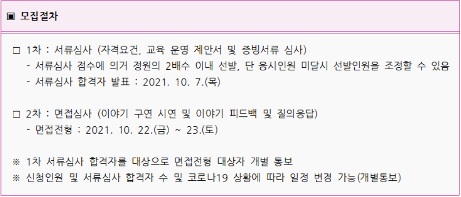 1차 서류심사(자격요건, 교육 운영 제안서 및 증빙서류 심사) → 2차 면접(이야기 구연 시연 및 이야기 피드백 및 질의응답)을 통해 최종 선발하게 된다.