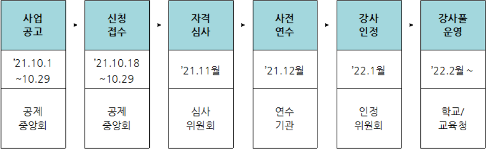 제2기 학교안전교육 전문강사 인력풀 모집의 신청기간은 2021. 10. 18.(월) ~ 2021. 10. 29.(금)까지로 전문강사 인력풀 시스템에 회원가입을하고 온라인 작성 및 첨부서류 등을 업로드 하면 된다.