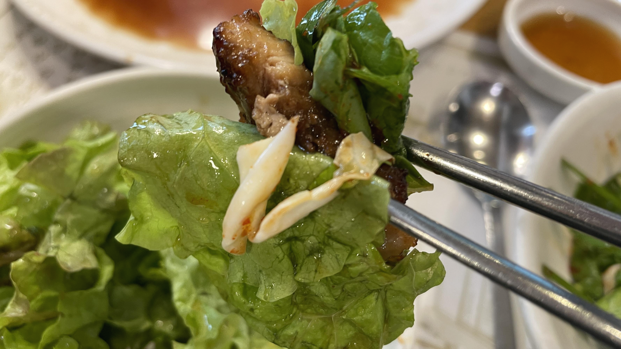 상추겉절이에 갈비 한 점 올려서 앙