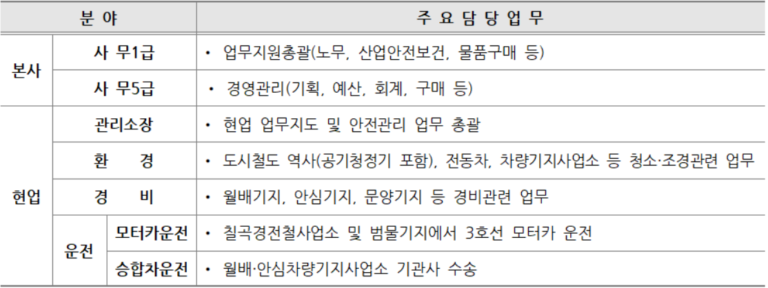 현업 중 ▶ 관리소장은 현업 업무지도 및 안전관리 업무 총괄하게 되고, ▶ 환경분야는 도시철도 역사(공기청정기 포함), 전동차, 차량기지사업소 등 청소·조경관련 업무를 담당한다.