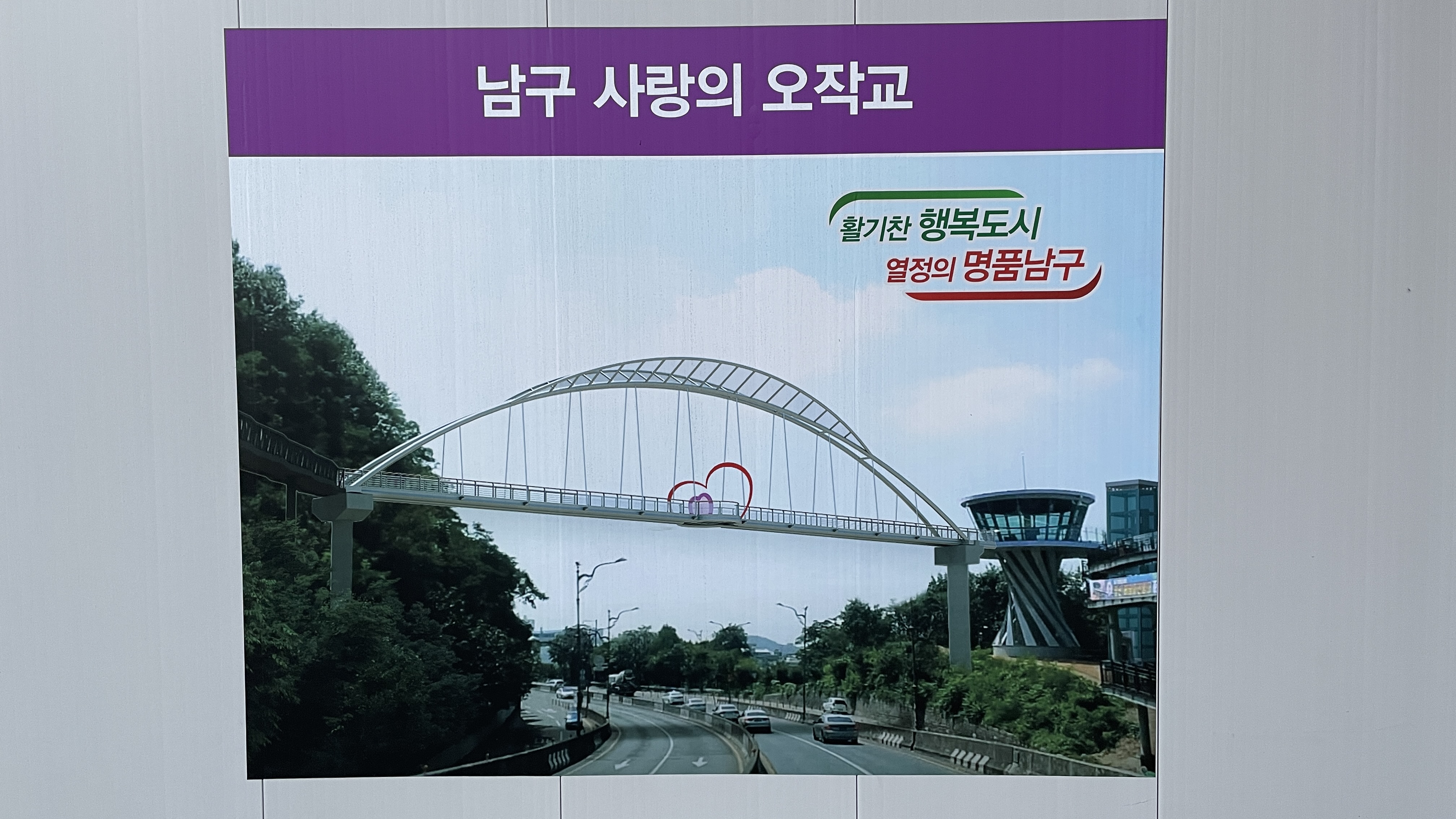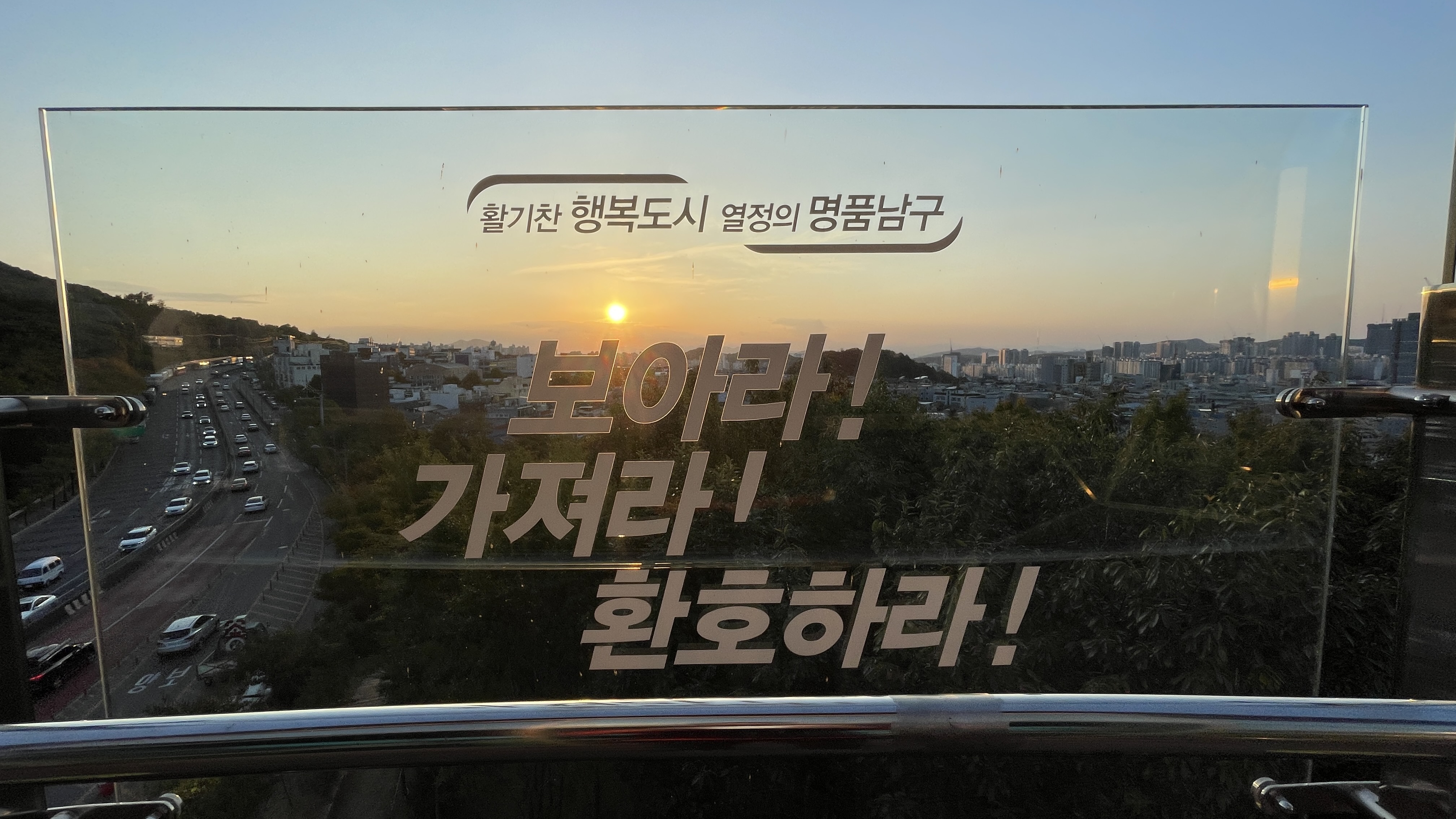 유리 난간에 붙여진 남구 홍부 문구와